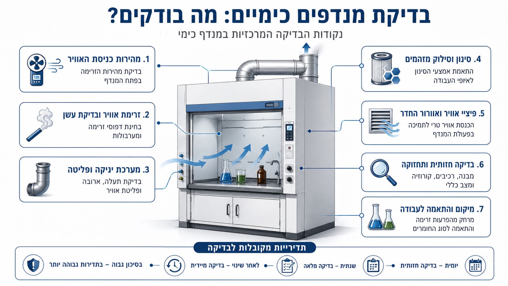 בדיקה תקופתית למנדף כימי נועדה לוודא שהמערכת ממשיכה לפעול באופן התואם את ייעודה, ושאופן השימוש בה, תנאי ההתקנה והתחזוקה שלה, אינם פוגעים ביכולתה לסלק מזהמים מאזור העבודה. לפי הרשות הלאומית להסמכת מעבדות, מנדפים כימיים מיועדים להקטנת החשיפה לחומרים רעילים ונפיצים, ולכן נדרש לא רק להפעילם, אלא גם לתחזקם ולבדוק אותם במסגרת נוהל מסודר ומתועד.